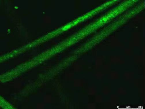 科学意义:作品拍摄材料来源于羊毛显微图,其中绿色是荧光染料所染的角蛋白,在制作过程中先原位染色后生物修复,提取角蛋白进行高价值利用是对废弃动物毛发资源开发的有效途径。
