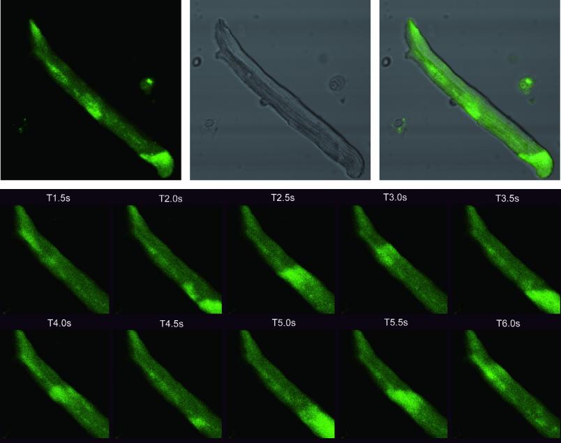图片创意:通过对钙瞬变的观测,可了解心肌细胞的功能活动特点和状态。本研究在原代提取的成体小鼠心肌细胞上负载钙指示剂(Fluo-3/AM),利用Olympus FV1000激光扫描共聚焦延时成像功能采集钙瞬变图像。