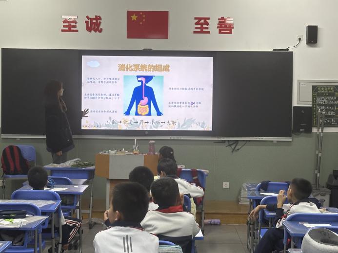 课后服务志愿者2023级本科生张学优从认识人体消化系统进行展开,介绍了食物是如何在人体内被消化吸收的,引导同学们对人体器官功能性进行思考,通过图文结合生动形象地向同学们详细介绍了食物消化吸收的过程,并采取奖励式授课方式,鼓励同学们积极互动,调动学生课堂积极性。课堂最后引出身体健康的重要性,以及同学们如何保护自己的身体,健康生活。