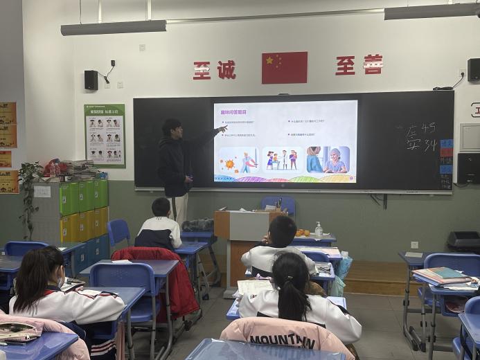 课后服务志愿者2023级本科生林闽俊以图片、动画和视频等形式生动介绍了人体免疫系统的构成,包括免疫器官、免疫细胞以及免疫分子的功能。阐述了免疫系统与日常生活之间的紧密联系,并分享了通过改善生活习惯来增强个人免疫力的有效方法。此外,活动设置了趣味问答环节,激发了同学们对免疫学知识的兴趣。