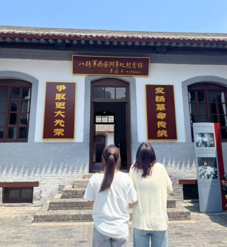 随后,实践团来到被誉为“延安门户”的西安八路军办事处纪念馆。这座古朴院落曾是抗日战争时期连接延安与全国的“红色桥梁”,承担着输送物资、接待青年、联络抗战力量的重要使命。在机要室、电台室、接待室等旧址,成员们端详当年使用的文件、电台、军装等实物,聆听讲解员讲述周恩来、朱德等老一辈革命家在此运筹帷幄的故事,以及工作人员冒着风险穿越封锁线、支援前线的感人事迹。“无数爱国青年从这里踏上奔赴延安的道路,无数抗战物资从这里送往烽火前线。”曹智仁同学驻足感慨,“这方院落里的每一寸土地,都浸透着共产党人的忠诚与坚守。”