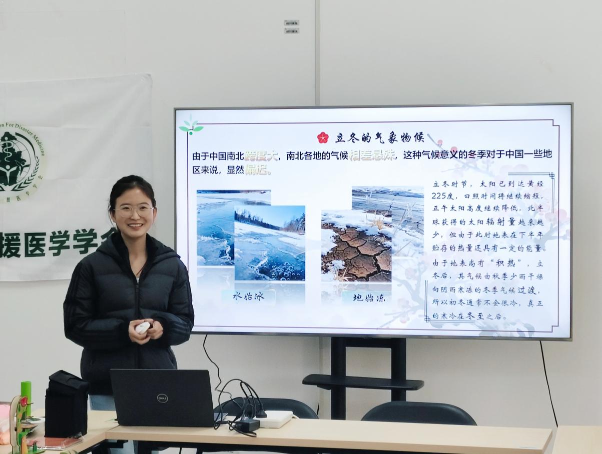 青蒲青年志愿者协会宣讲团成员张若涵,系统地进行了立冬知识的趣味科普:从“立冬是二十四节气的第十九位、太阳到达黄经225°”的天文定义,到饱含“万物藏敛节气哲学”的历史渊源,再到以“水始冰、地始冻、雉入大水为蜃”的物候特征,张若涵用生动的语言描绘出冬季来临的自然景象,深入解析古代帝王“迎冬礼”的礼节文化,让青少年感受到节气背后的厚重历史。