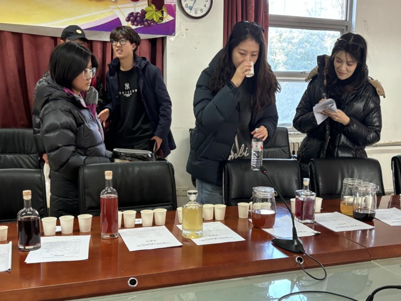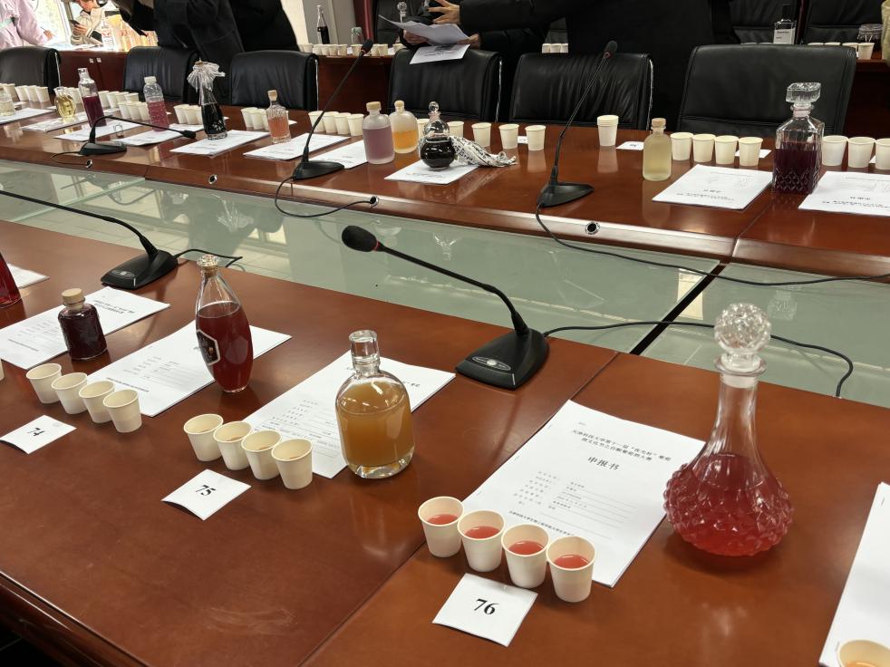比赛现场,工作人员提前完成了场地布置:贴标签、摆杯子、整理评分表,将每一份参赛作品有序陈列。来自生物工程的评委老师围绕酒液外观、香气层次、口感协调性,结合酿造记录的完整性展开细致评审,对每一支团队的作品给出专业点评。