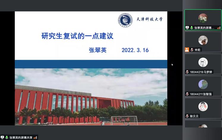 张翠英院长对学院历史沿革、学院授予学位点情况、教学情况、立体健全的研究生学位建设情况进行了详细介绍,并从认识复试、准备复试和复试过程三个层面给出自己的建议。张成林教授从研究生导师和复试面试官的角度出发,从目前的任务、复试注意事项及技巧、如何选择导师三个方面做了深入细致的分享,并对同学们在复试过程中能够锦上添花的高亮部分进行解释和点拨。王巨克老师针对今年线上复试的形式给学生们介绍了网络复试准备相关内容。