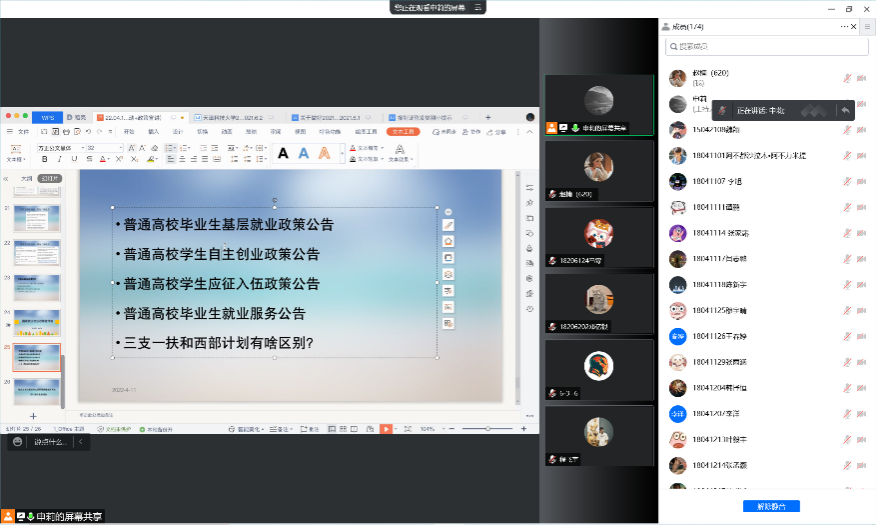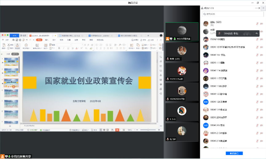 国家就业创业政策宣讲会在线召开。会议由申莉老师主讲,2022届全体本科毕业生在线参加会议。