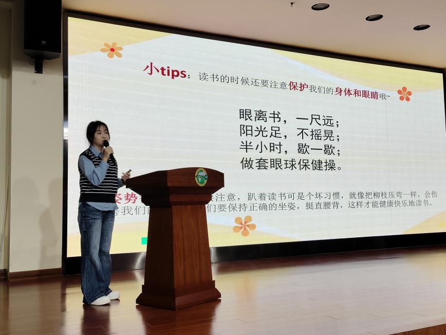 研究生、天津经开区蓝天救援队志愿者陈阳,以西班牙“玫瑰与书”的浪漫传说为切入点,通过趣味故事与图文展示了世界读书日的起源及其深远的全球文化意义。随后,她沿着历史脉络介绍书籍的演变,巧妙串联起中华文明演进与科技发展的轨迹。讲解过程中,陈阳分享了古今中外的阅读趣闻,以生动的讲述激发了青少年对阅读的浓厚兴趣,引导学生们深入思考读书的重要意义。