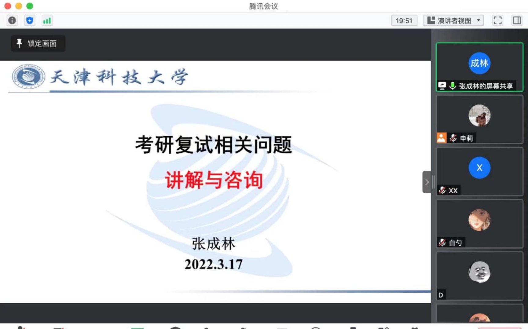 张翠英院长对学院历史沿革、学院授予学位点情况、教学情况、立体健全的研究生学位建设情况进行了详细介绍,并从认识复试、准备复试和复试过程三个层面给出自己的建议。张成林教授从研究生导师和复试面试官的角度出发,从目前的任务、复试注意事项及技巧、如何选择导师三个方面做了深入细致的分享,并对同学们在复试过程中能够锦上添花的高亮部分进行解释和点拨。王巨克老师针对今年线上复试的形式给学生们介绍了网络复试准备相关内容。