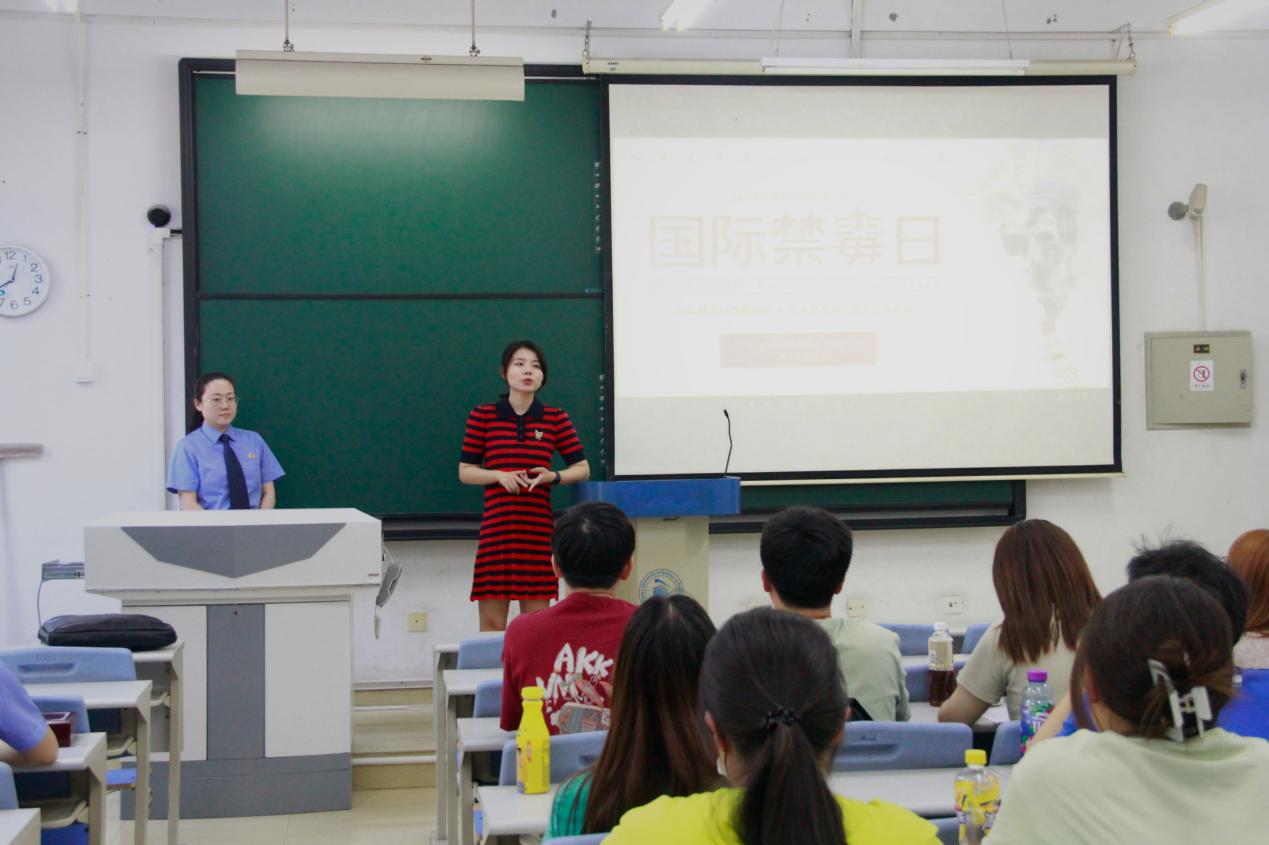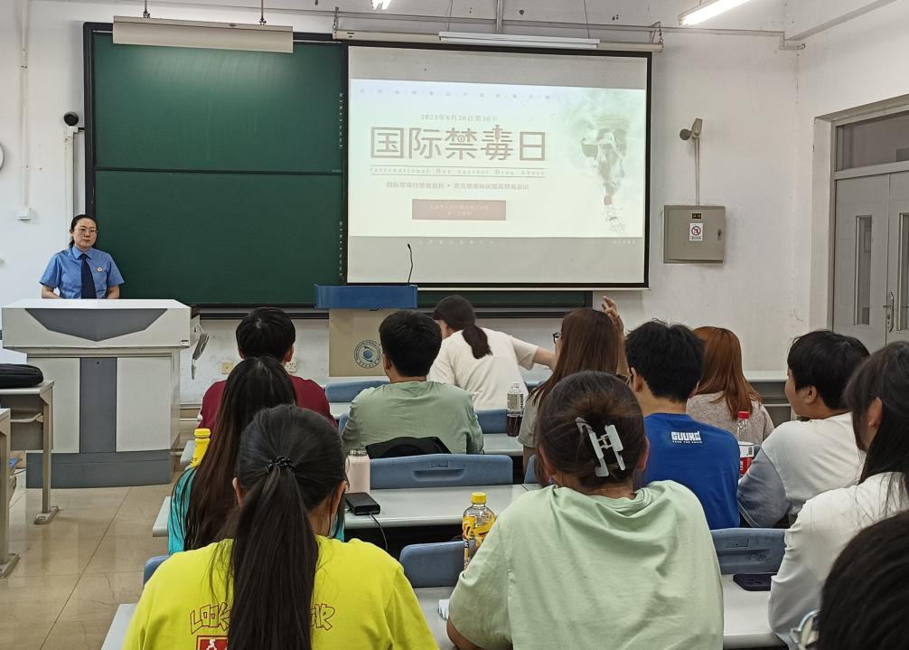 邀请了天津市第三人民检察院第三分院的检察官在滨海校区中院3号楼104围绕“健康人生、绿色无毒”开展禁毒宣讲。宣讲会由学院辅导员申莉老师主持,各年级学生代表参会。