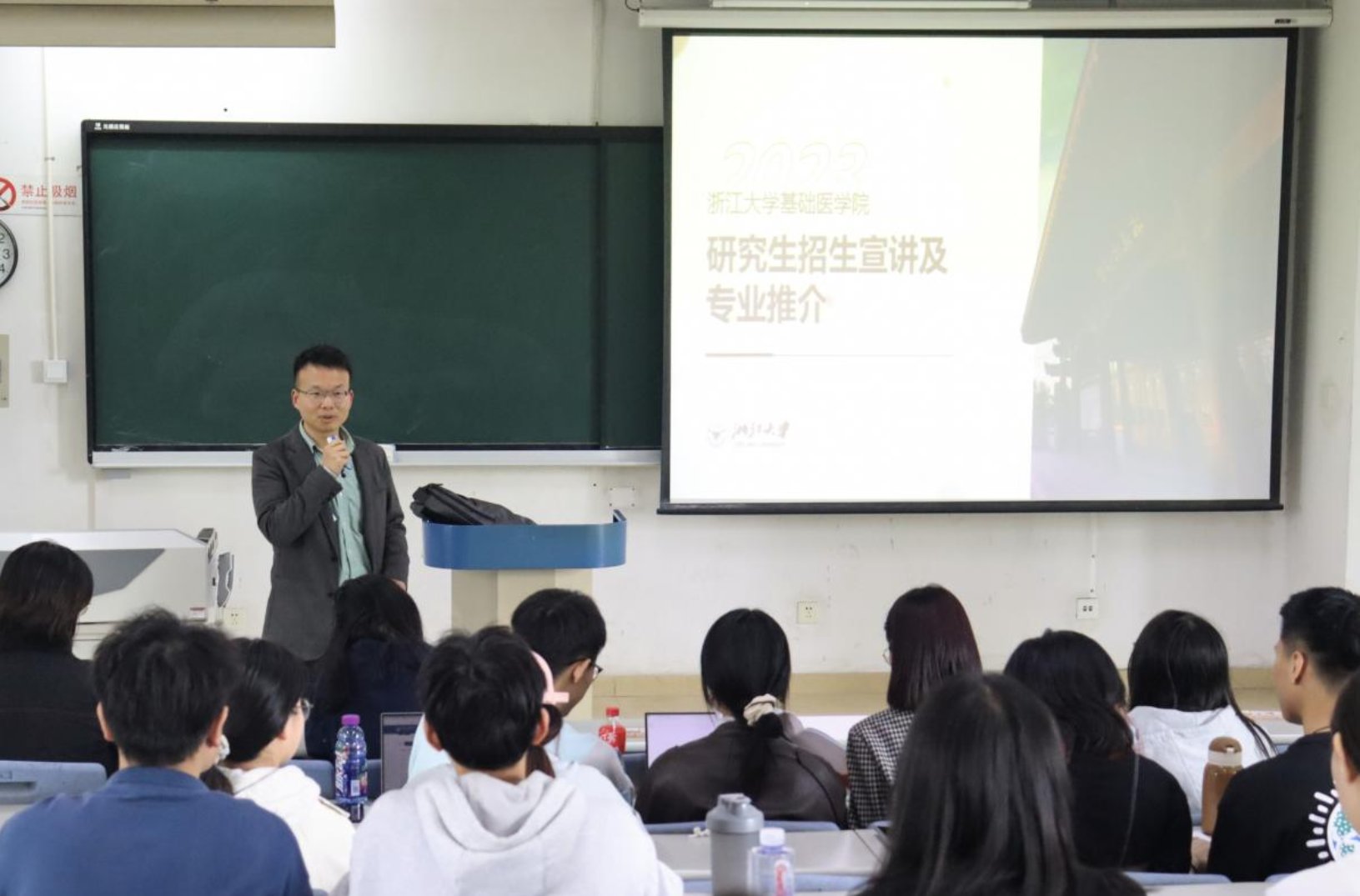 于滨海中校区3-211教室召开浙江大学基础医学院研究生招生宣讲会,会议由浙江大学基础医学院毛旭明教授主讲,2020级本科生辅导员周丽媛老师主持。
